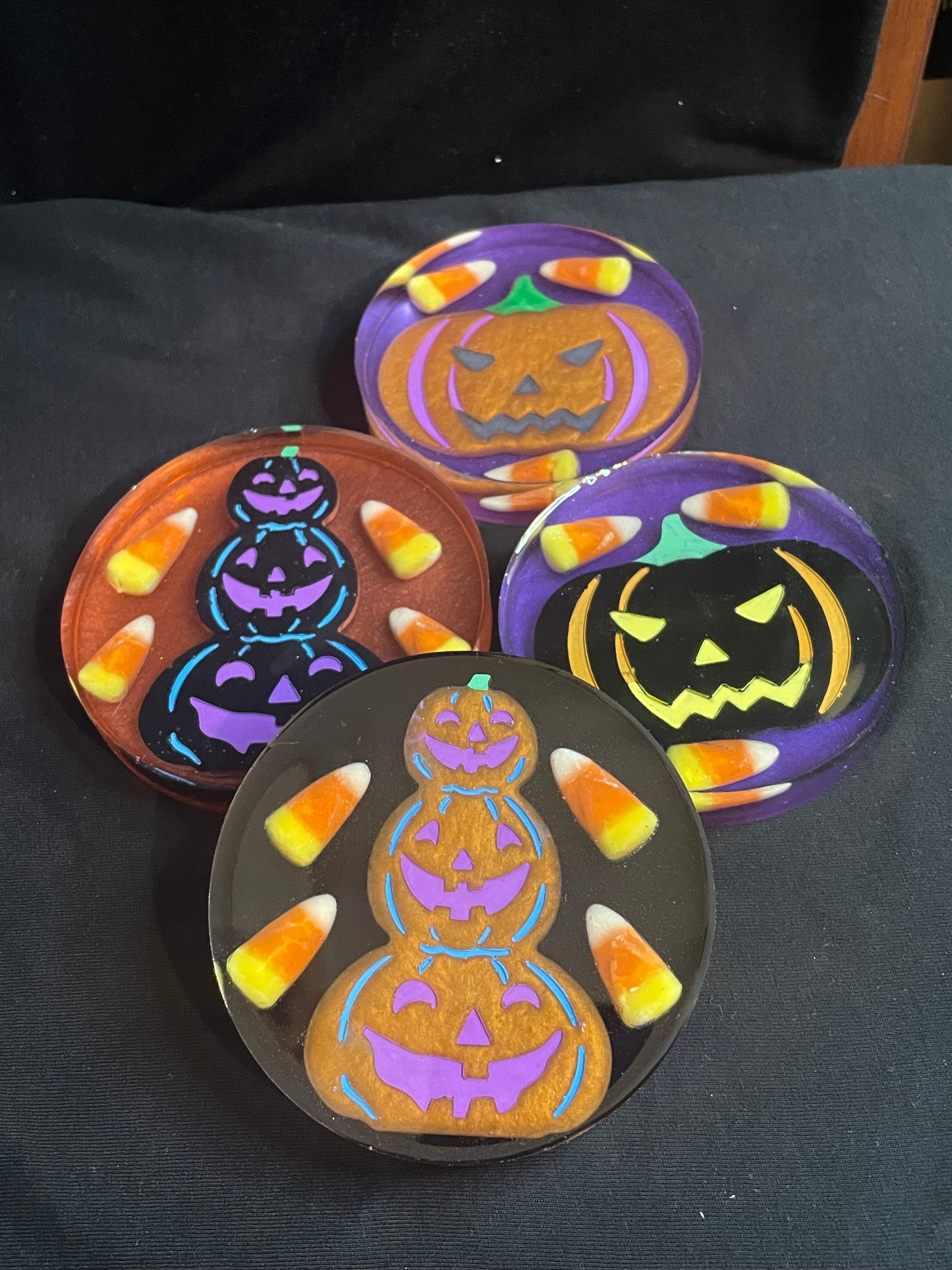 Add a festive touch to your home this Halloween with these handmade pumpkin coasters. Featuring bold jack-o’-lantern designs, candy corn accents, and a variety of spooky styles.